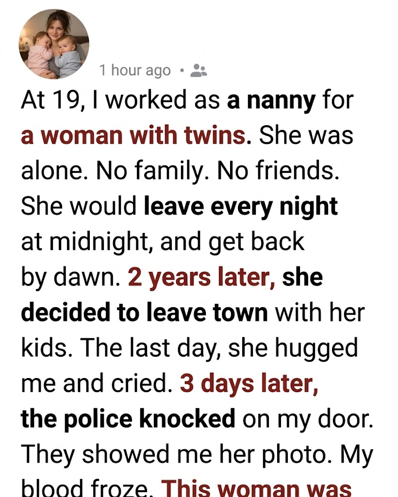 She had no family. No pictures on the walls. No visitors. No phone calls. Just her and the twins—Luca and Mira. They were barely a year old when I began working as their nanny.