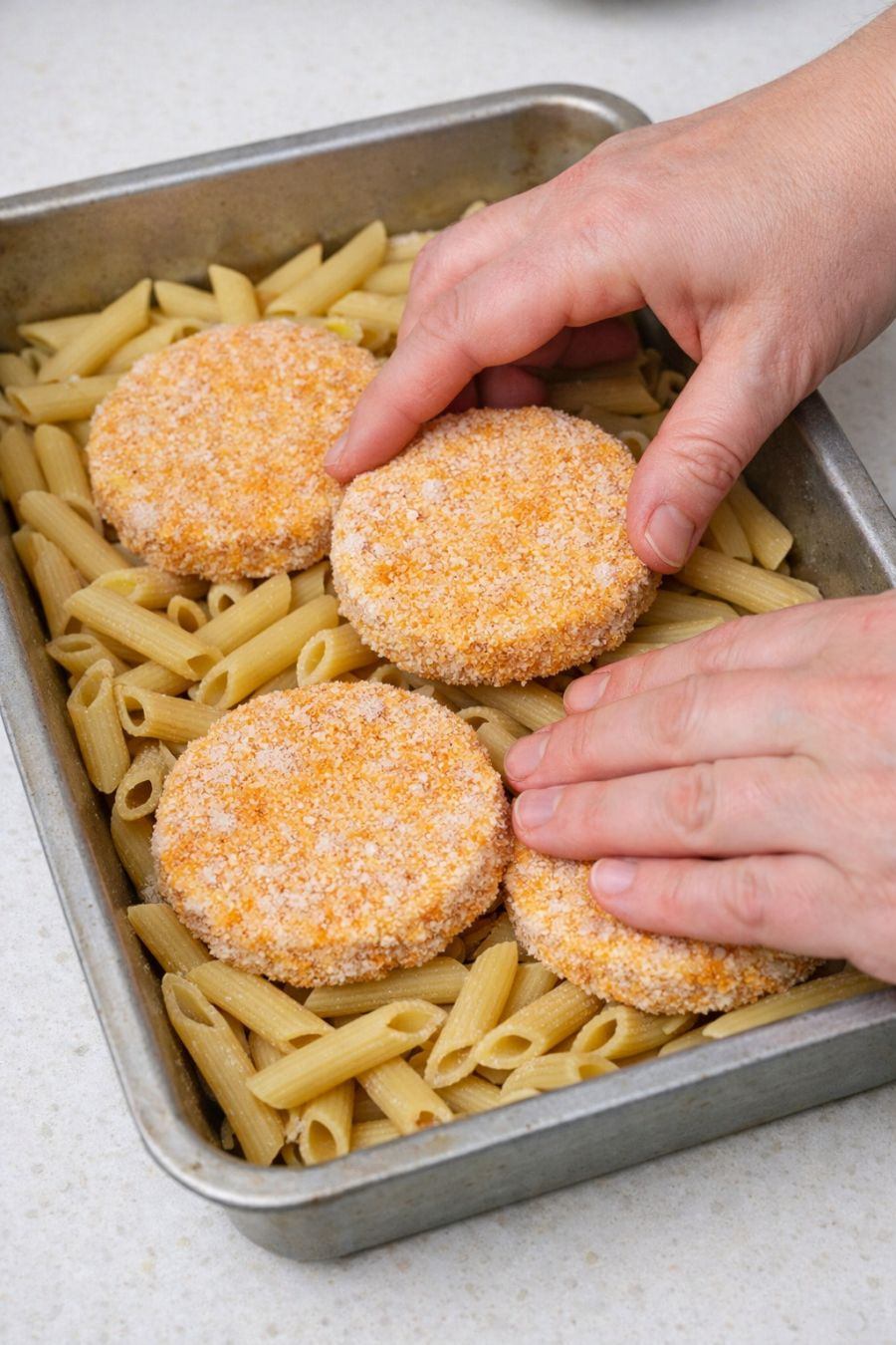 Bake the covered pan on the center rack for 30 minutes, until the pasta is mostly tender and the chicken patties are heated through.