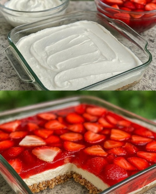 This dessert has a unique charm because it offers the best of all worlds: salty, sweet, creamy, and fruity. The buttery pretzel crust creates a crunchy base, the cream cheese layer adds a smooth tang, and the strawberry Jell-O with fresh strawberries provides a refreshing finish. It’s like a cheesecake meets a fruit tart—with a surprise twist of pretzel crunch. 🥄