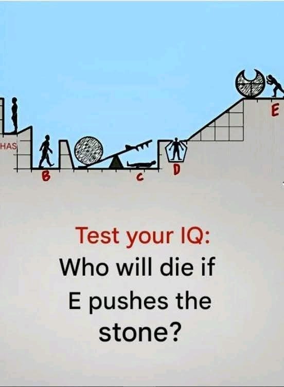 At the bottom of the slope, D is stuck, only his head sticking out. Next to it, a swing carries another rock, adding to its weight. Below the high part of this swing, deadly spikes threaten C, lying just below. B and A are positioned further to the side. The question is simple: if E pushes the rock, who dies first?